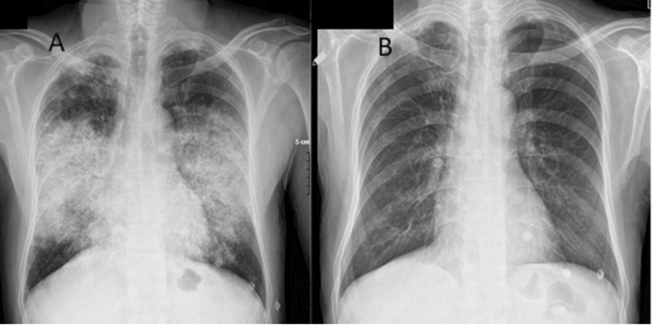 Chest X-ray (PA view) at presentation (A) and after 8 weeks (B)