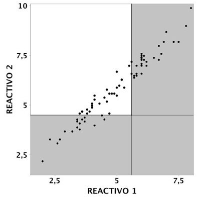 Como podemos observar, dicha línea no está contenida en el intervalo de confianza del 95% de la diferencia promedio. En realidad, la línea del cero se encuentra por fuera de los límites de concordancia (promedio +/- 1.96 desvíos standard). Tomados en conjunto, estos resultados sugieren fuertemente que los métodos no son intercambiables.(7) Las implicancias en la práctica clínica diaria pueden observarse en la Figura 2. En el área sombreada se observan los pacientes donde la decisión terapéutica sería la misma. En contraste, en el área clara se demuestra que en 25 de 73 muestras (34%), o sea, en uno de cada tres pacientes, la decisión terapéutica sería distinta si se utilizara el reactivo 1 (normofosfatemia) o el reactivo 2 (hiperfosfatemia).