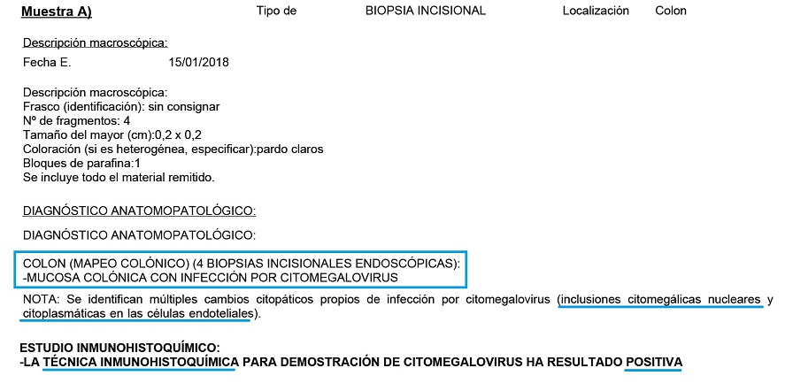 Figura 1. Informe anatomopatológico de la colonoscopía, en el que se confirma positividad al CMV